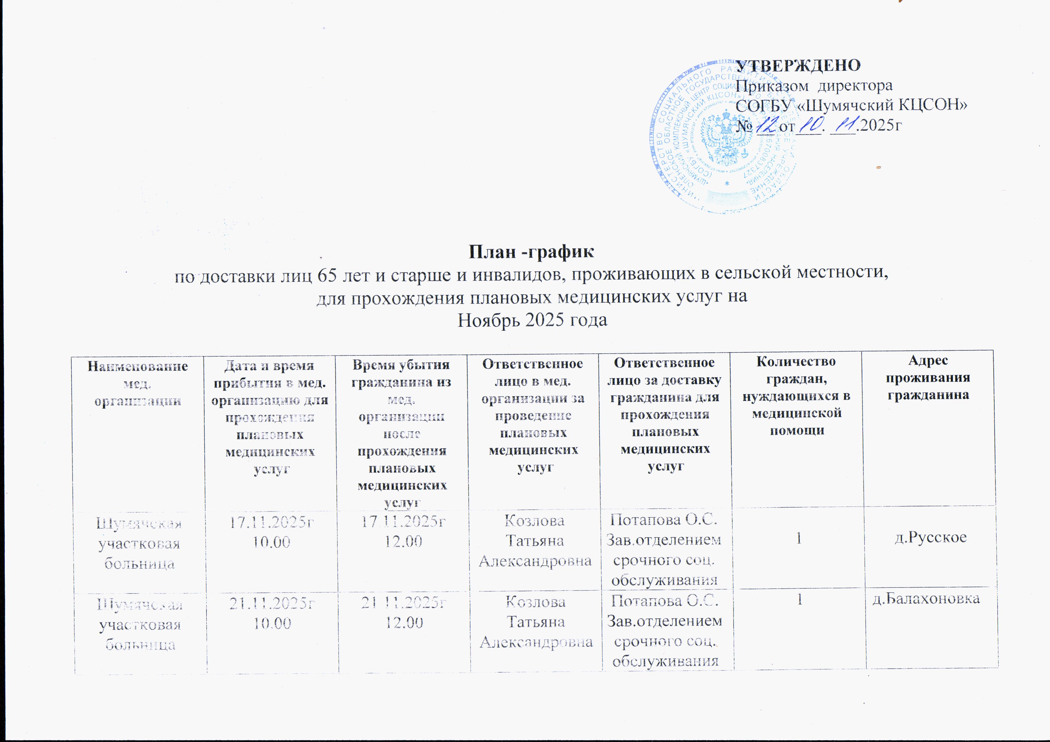 Ежемесячно СОГБУ «Шумячский КЦСОН» осуществляет доставку граждан 65 лет и старше и инвалидов, проживающих в сельской местности в медицинскую организацию для получения необходимых плановых медицинских услуг, а также осуществляется доставка на дом медицинских работников с целью предоставления плановых медицинских услуг и доставка гражданину лекарственных препаратов и медицинских изделий, на основании предоставленных планов-графиков из Шумячской участковой больницы. Мобильная бригада осуществляет сбор граждан, нуждающихся в доставке в медицинские организации по месту их жительства. А также осуществляется обратная доставка граждан к месту жительства бесплатно.